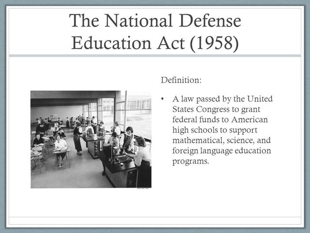 Defense Education Act of 1958 NDEA whichencourages and supports language development in a variety of ways. In response Congress authorizes the National Defense Education Act which provides federal aid to state and local school districts to improve the teaching of math science and foreign languages. Many believe that the launch of the Soviets Sputnik satellite enabled the bills proponents to get it through Congress.