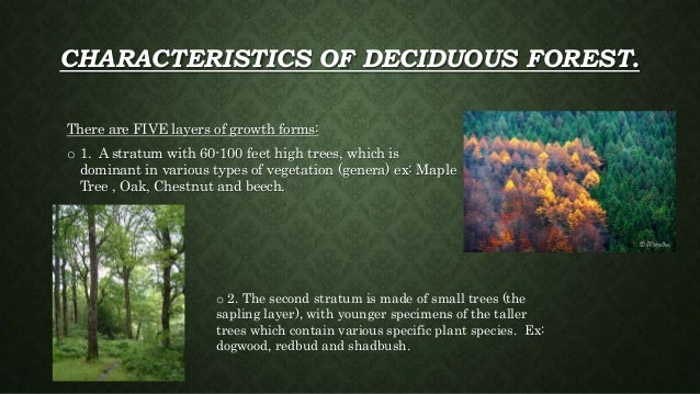 They have needle-like leaves with a couple of exceptions. The different layers of trees and plants in the deciduous forest provide habitats for different animals. Deciduous forests have a long warm growing season as one of four distinct seasons.
